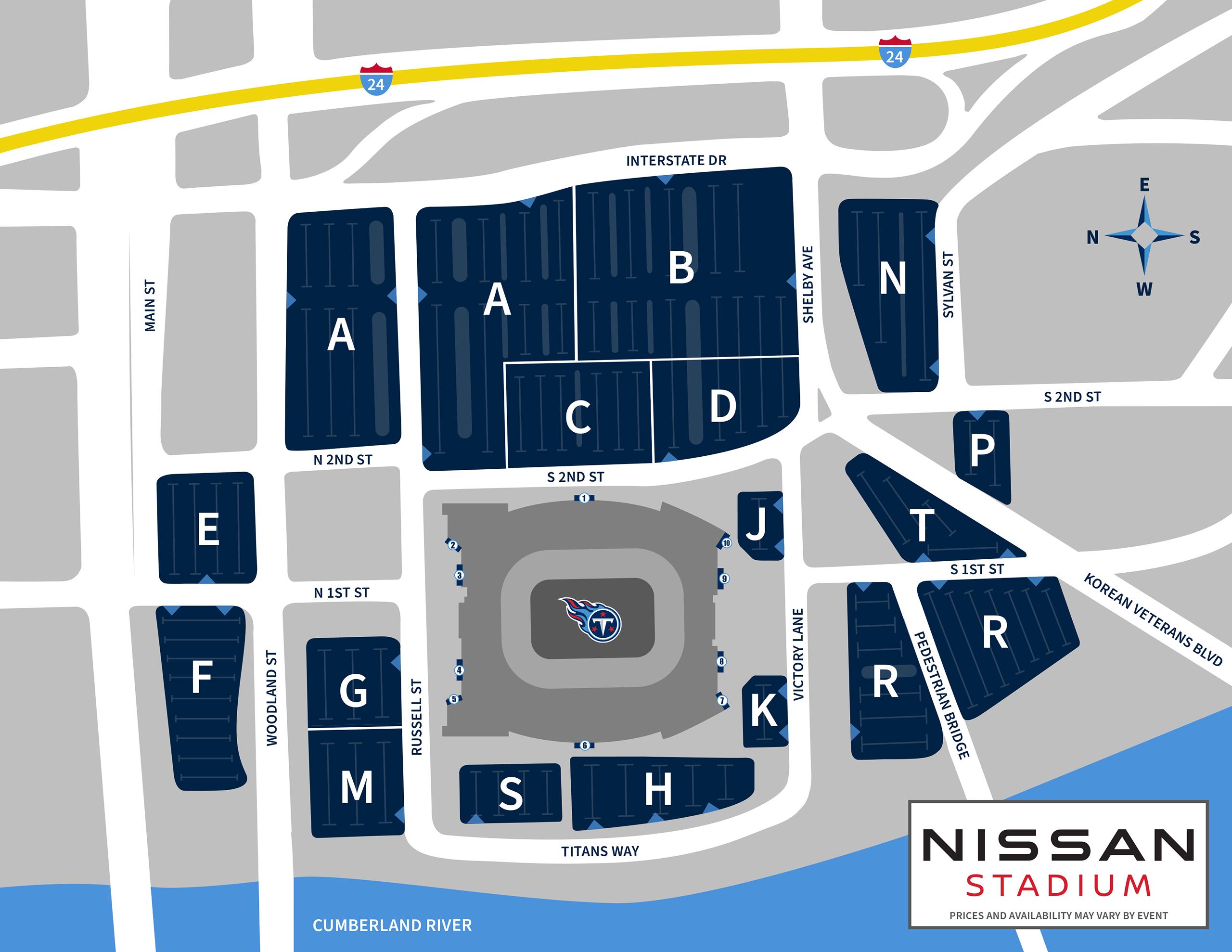 View Larger Map. Nissan Stadium Parking Maps. Nissan Stadium Parking Map. For Titans games fans may enter any Gate 1-10 Only Club Members and Suite Holders will be allowed entry through the Stadium Club entrances.